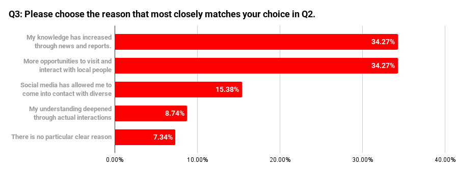 When respondents were asked how their impressions of people from overseas have changed in recent years, the most common answer was “they haven’t changed much,” selected by 44.89% (233 respondents).