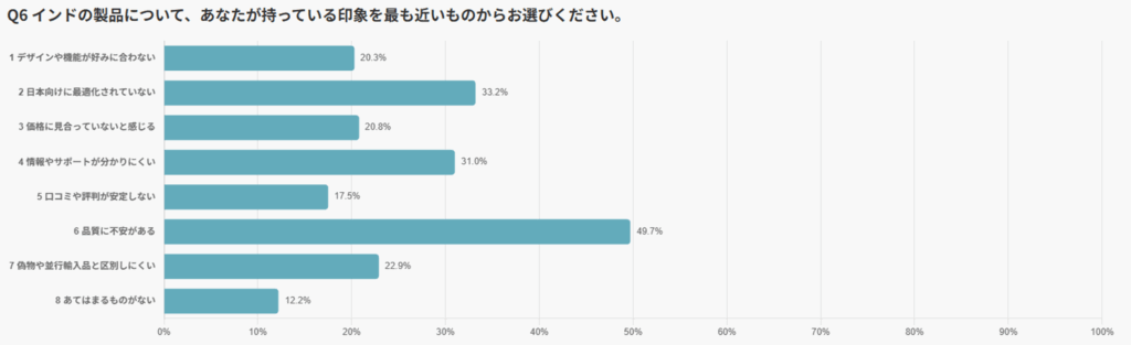 When it comes to Indian products, the most common perception was “concerned about product quality” at 49.7%, significantly higher than any other category.