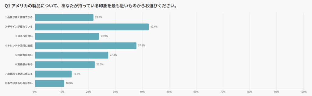 When it comes to American products, many respondents associated them with “outstanding design” (42.4%) and being “trend-sensitive” (37.8%). “Technological strength” (27.3%) and “high quality” (25.4%) also ranked high, showing that American goods are valued for both functionality and creativity.