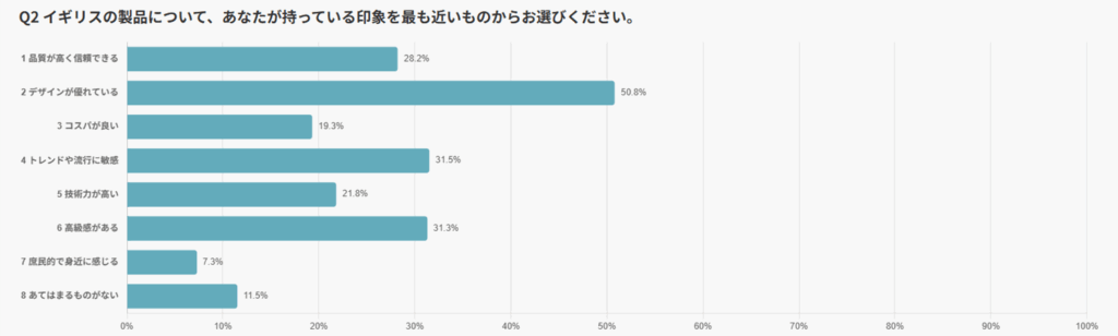 For British products, “outstanding design” stood out most strongly (50.8%), followed by “luxury” (31.3%) and “trend-sensitive” (31.5%). Overall, British goods are associated with a refined, high-quality image—valued in a way distinct from American products.