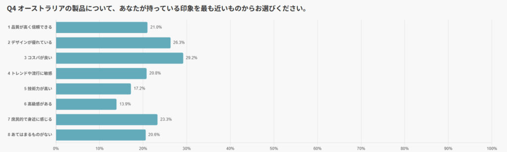 For Australian products, the most common associations were “good cost performance” (29.2%) and “down-to-earth and accessible” (23.3%). Rather than being valued for luxury or flashiness, they are appreciated as an unpretentious quality that fits seamlessly into everyday life.