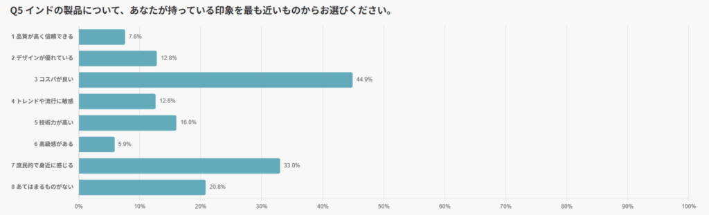 For Indian products, the most common associations were “good cost performance” (44.9%) and “down-to-earth and accessible” (33.0%). Affordability is clearly a strong factor influencing purchase decisions.