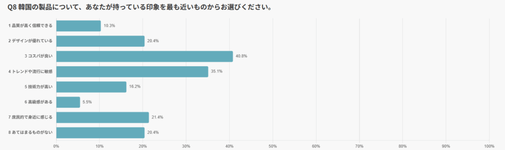 Korean products are becoming an increasingly familiar part of daily life for Japanese consumers. The top associations were “good cost performance” (40.8%) and “trend-sensitive” (35.1%), followed by “outstanding design” (20.4%). Affordable pricing combined with stylish appeal has earned them strong support.