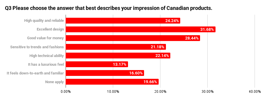 Evaluations of Canadian products are generally calm and stable. “Outstanding design” (31.7%) and “good cost performance” (28.4%) ranked almost evenly, showing no extreme bias in perception. Rather than being associated with flashiness, Canadian goods are often valued for their sense of sincerity and reliability—qualities that align closely with Japanese values.