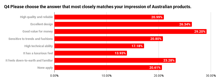 For Australian products, the most common associations were “good cost performance” (29.2%) and “down-to-earth and accessible” (23.3%). Rather than being valued for luxury or flashiness, they are appreciated as an unpretentious quality that fits seamlessly into everyday life.