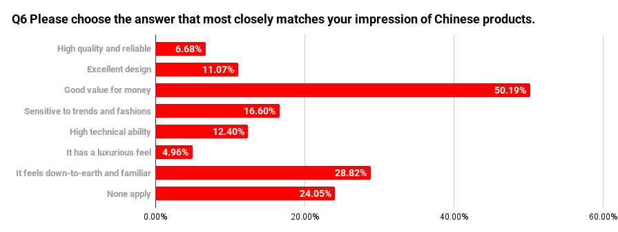 At the same time, 24.0% answered “none of the above,” showing that perceptions are divided. While many consumers are attracted by affordability and convenience, others express uncertainty about quality and vary in their level of trust toward Chinese brands.