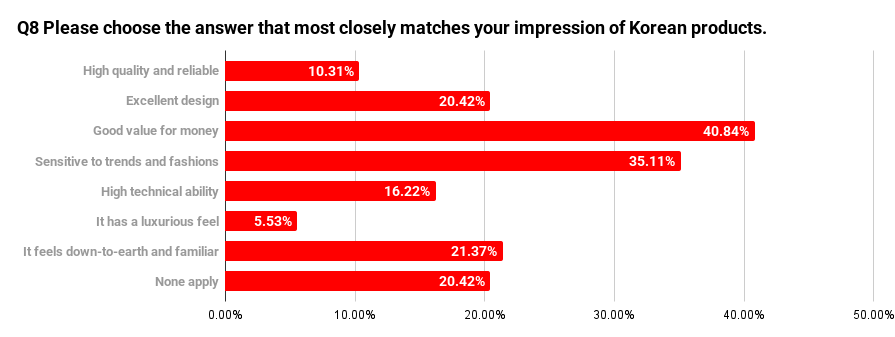 Korean products are becoming an increasingly familiar part of daily life for Japanese consumers. The top associations were “good cost performance” (40.8%) and “trend-sensitive” (35.1%), followed by “outstanding design” (20.4%). Affordable pricing combined with stylish appeal has earned them strong support.