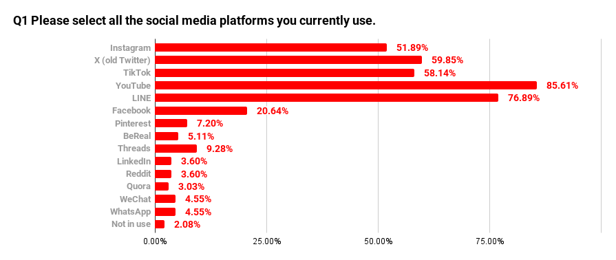 While Q1 examined the overall range of social media platforms used, this question focuses on identifying which platform people spend the most time on in their daily lives. In Japan, where using multiple platforms in parallel is the norm, asking respondents to choose the single platform they use the most helps reveal where actual usage is most concentrated.