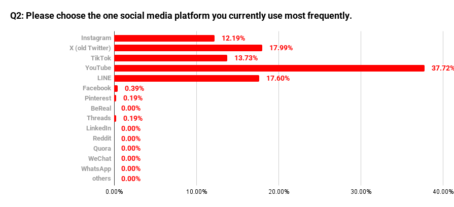 The most frequently selected platform was YouTube, at 37.72% (195 respondents). Although YouTube already showed a high usage rate in Q1, it stands out even more clearly as the “most used” platform, indicating that video content sits at the center of information consumption and entertainment for Japanese users.