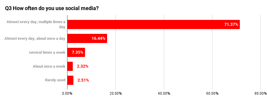 The largest share of respondents—71.37% (369 people)—answered that they use social media “almost every day, multiple times a day.” This indicates that more than 70% of users check social media repeatedly throughout the day.