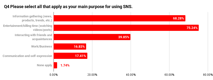 Other purposes included “content creation or self-expression” at 17.41% (90 respondents) and “work or business” at 16.83% (87 respondents), both remaining below 20%. This shows that in Japan, relatively few people use social media actively for publishing content or professional purposes.