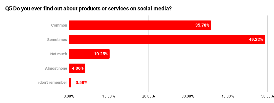 The most common response was “sometimes,” selected by 49.32% (255 respondents). This shows that encountering products or services on social media is not a special or rare experience, but something that occurs intermittently in daily life.