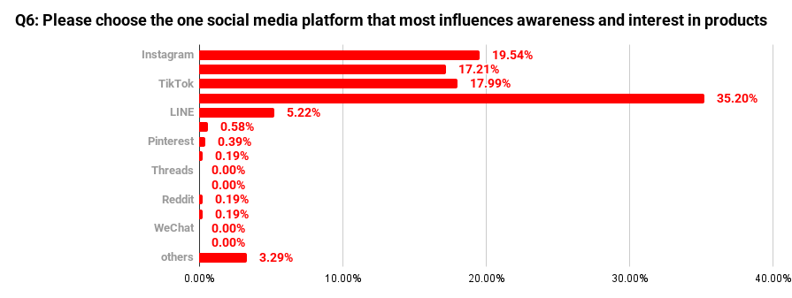 In contrast, LINE accounted for only 5.22% (27 respondents). Although it has a high daily usage rate, its impact on generating interest in products or services is more limited compared with platforms centered on browsing videos or posts.