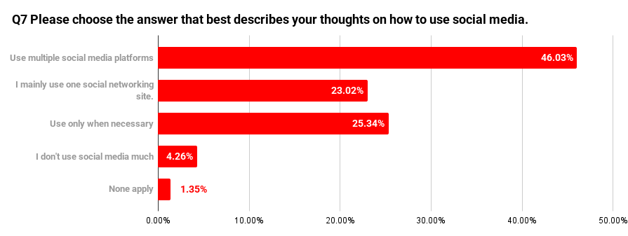 This was followed by “I use social media only when necessary,” at 25.34% (131 respondents), and “I mainly use one primary platform,” at 23.02% (119 respondents). A significant number of people adjust their level of engagement rather than remaining constantly connected.