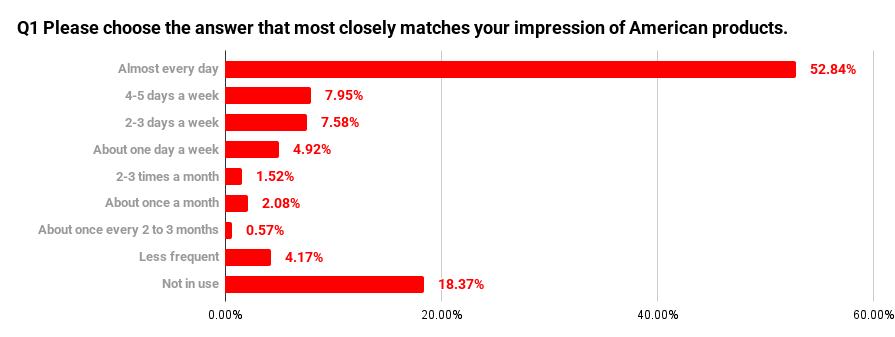 For men, “Almost every day” also accounted for the majority at 53.94% (178 people), showing no significant difference in daily habit compared to women. However, the “Do not use” rate was slightly higher at 19.09% (63 people).