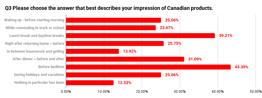 Based on the results from the 431 Japanese respondents, it is evident that TikTok is frequently used during “transitional moments” throughout the day. The most common timing was “Before bed” at 43.39% (187 people).
