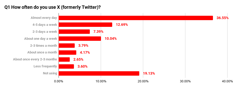 Looking at the data by age group, the overwhelming establishment of X among the younger generation, particularly those in their 30s and under, is reflected in striking figures. Among teens, 69.09% (38 people) use it “almost every day,” making X something of an “informational breathing space” for the digital native generation.
