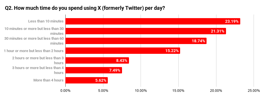Comparing stay times by age group reveals that younger users tend to remain in the X space longer and consume content more deeply. Specifically, among those in their 20s, the group spending 30 minutes or more per day reached approximately 45%, suggesting exploratory usage that goes beyond merely checking notifications.