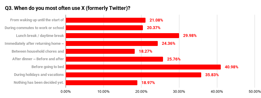 A detailed look at the 437 responses from our in-house survey reveals that X is not fixed to a specific time slot but is accessed at various “boundaries” throughout daily life. The most common response was “before bed” at 44.39% (194 people), showing an established habit of catching up on the day’s topics as a way to wind down.