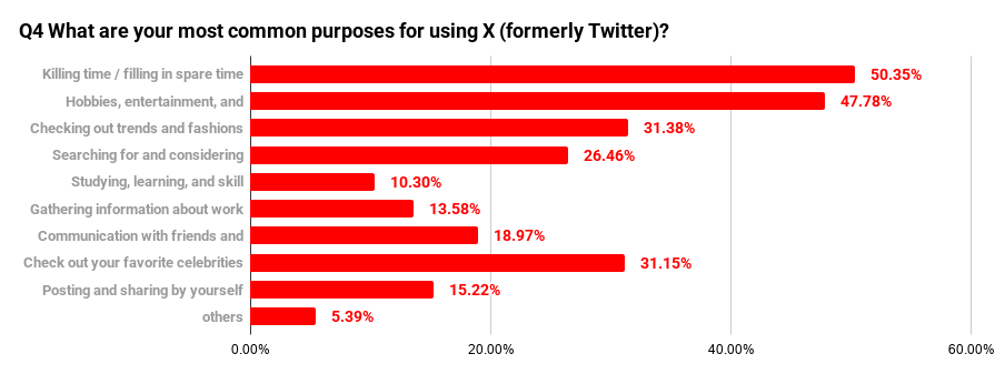 An analysis of the motivations for opening X reveals a multi-layered set of needs that go beyond simple “time-killing.” While the most common response was “killing time / filling gap time” at 60.41% (264 people), it is noteworthy that “hobbies, entertainment, and relaxation” also recorded a high figure of 44.85% (196 people).