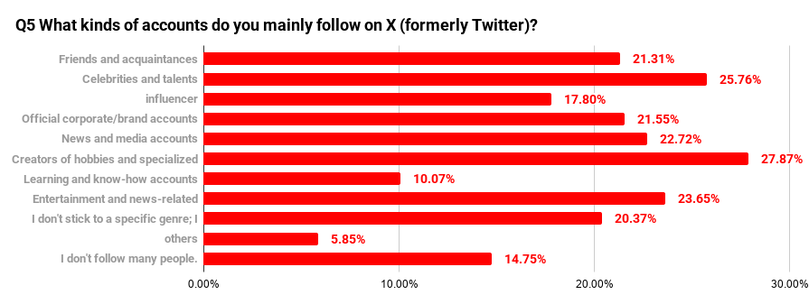 An analysis of which accounts users follow for continuous information consumption reveals a clear trend toward information gathering centered on “people.” The most common response was “Celebrities/Personalities” at 40.27% (176 people), followed by “Influencers” at 31.35% (137 people).